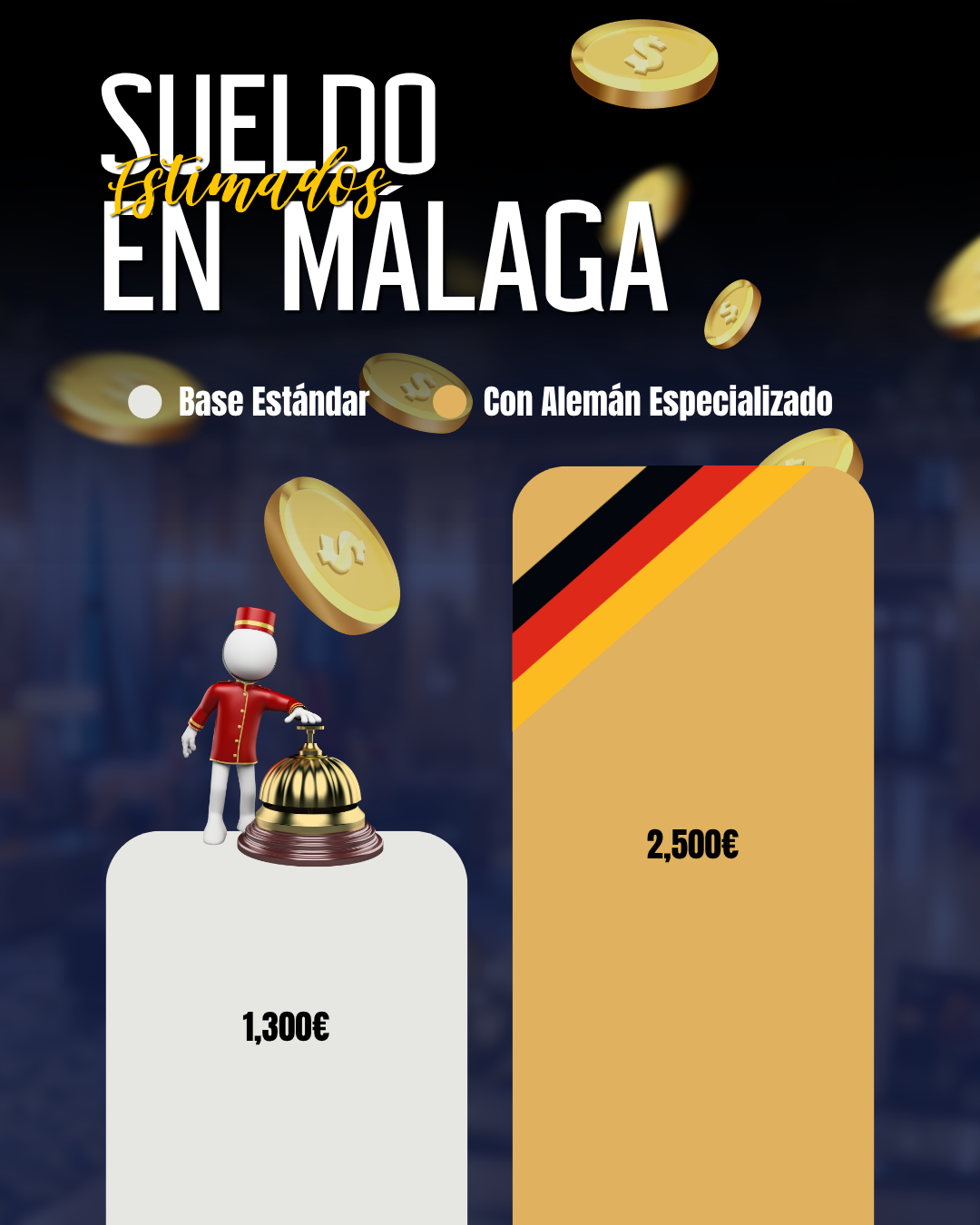 • Salario Premium (Con Alemán Especializado): Los perfiles bilingües en hoteles de 4 y 5 estrellas acceden a sueldos de entre 1.800€ y 2.500€+ mensuales, con contratos estables, mejores horarios y acceso a incentivos.